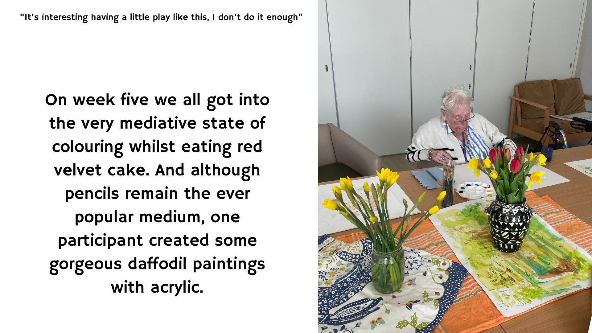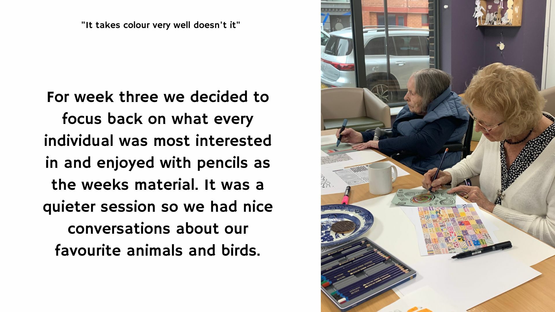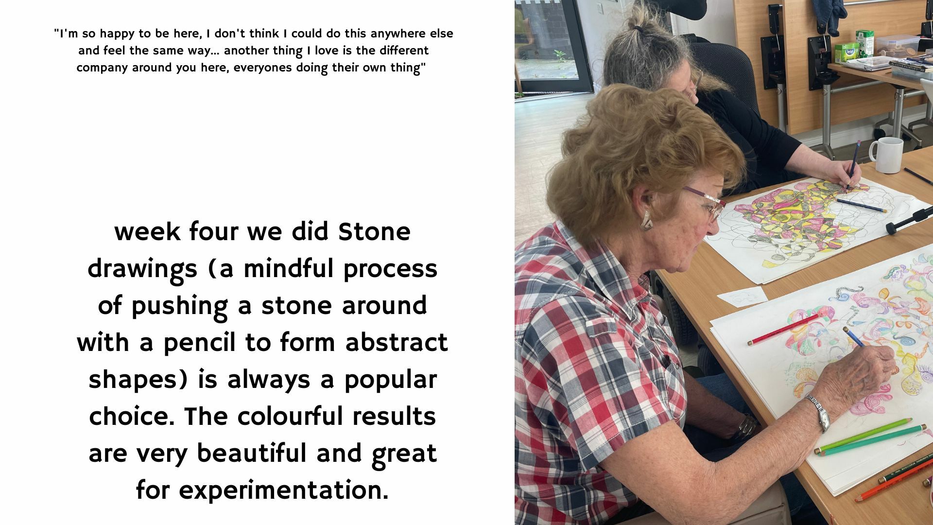 “I’m quite happy to learn something new, I quite like the calm atmosphere of the room. I like the simplicity and no rushing around. It’s funny how you fall into things without even realising” - participant